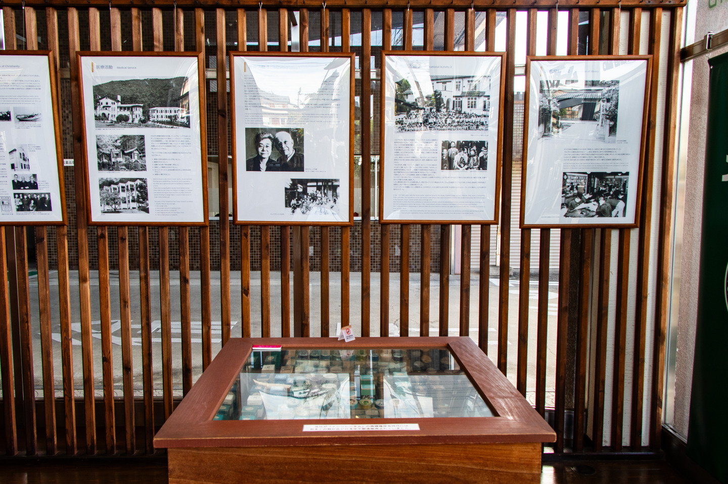近江兄弟社の本社1階ロビーを「メンターム資料館」として無料開放。創業者であるウィリアム・メレル・ヴォーリズ氏の歩んだ足跡を写真パネル展示しています。