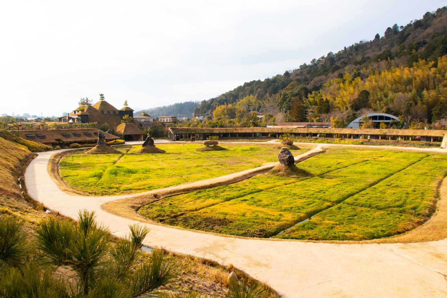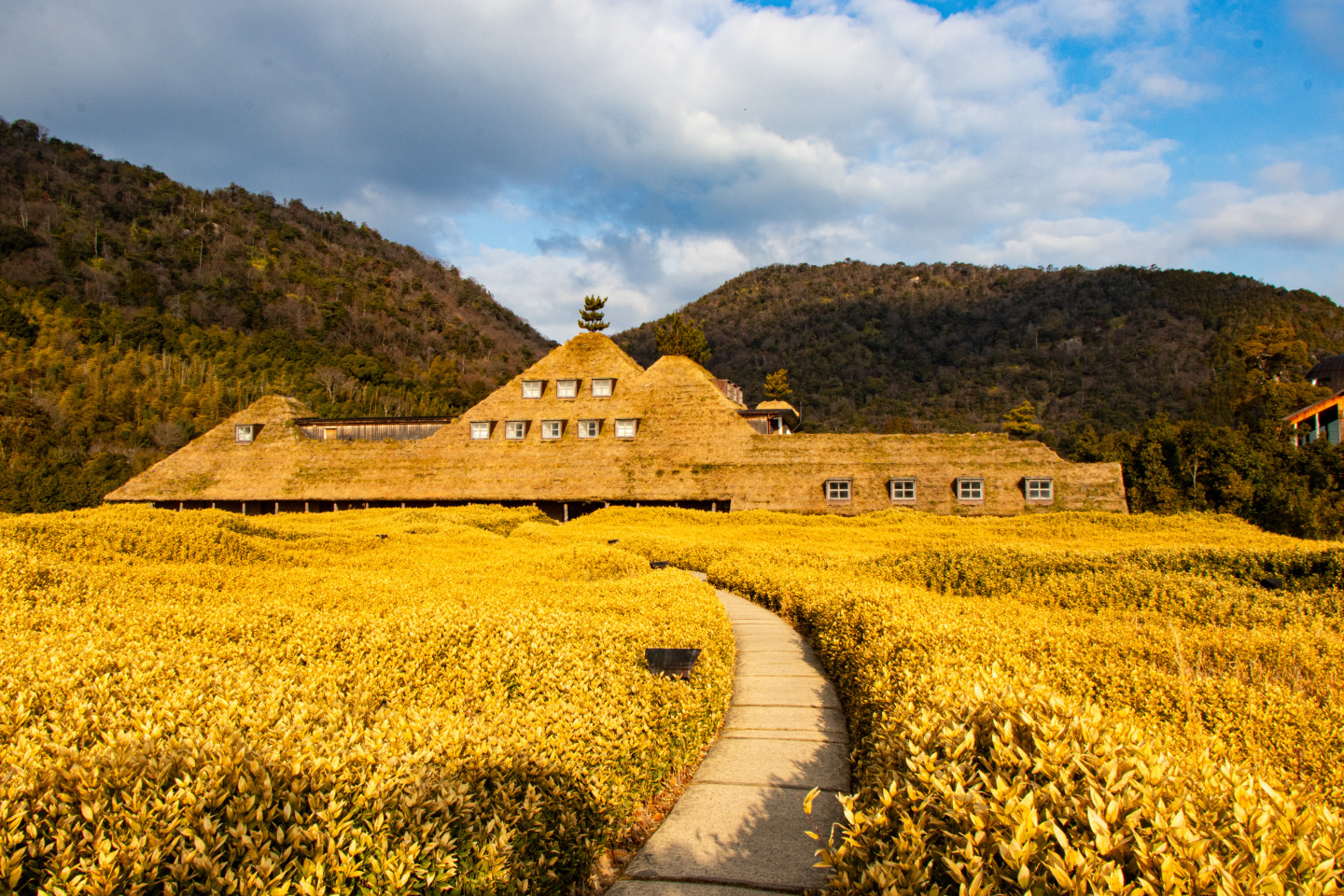 草屋根が美しいメインショップ、近江八幡の原風景を再現した田んぼの中庭、バームファクトリーやフードガレージなど実に魅力的な建物で彩られています。