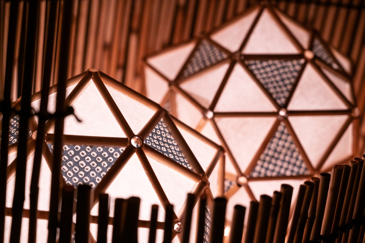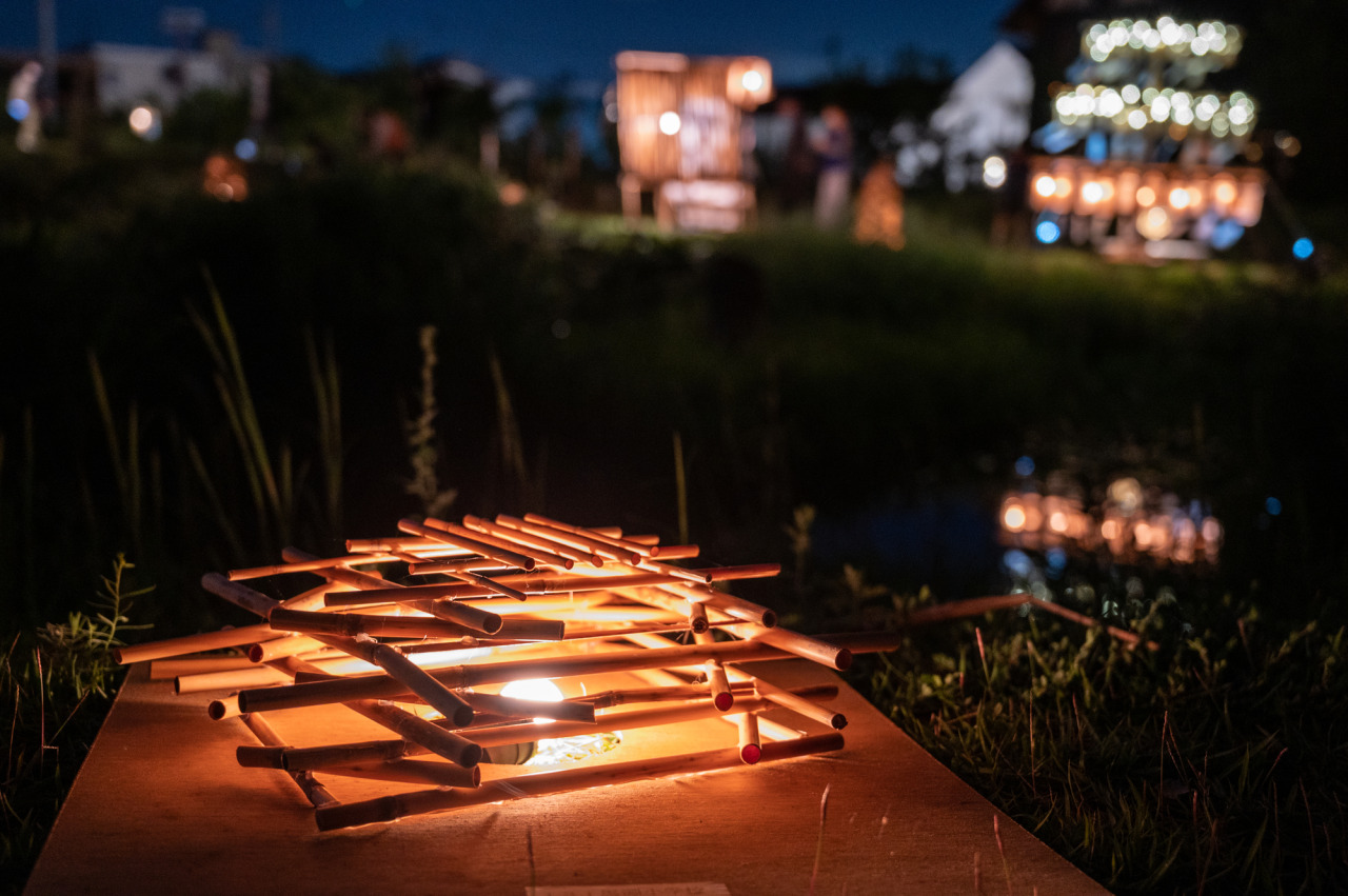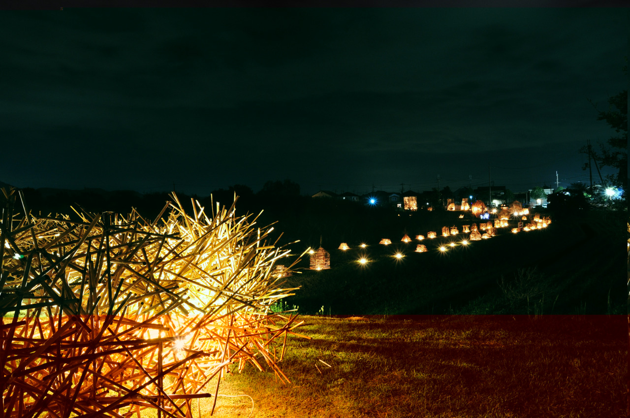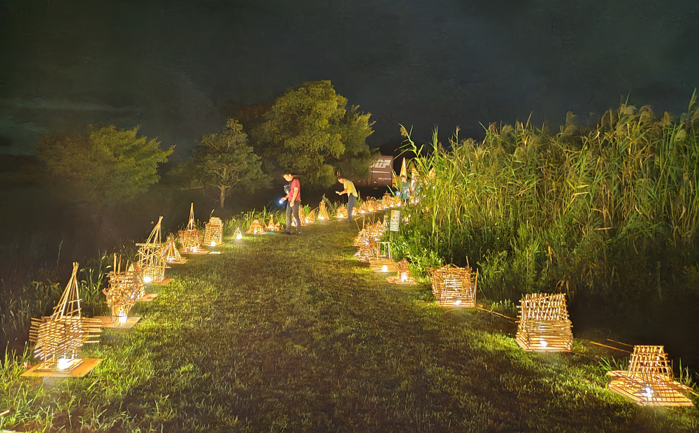 琵琶湖一帯に群生するヨシ。ヨシはたくさんの動植物の生息地を守り、琵琶湖の水質を守る日本の原風景です。そうしたヨシの大切さを再認識し、親しみを持ってもらうために「西の湖 ヨシ灯り展」は始まりました。イベント当日には、西の湖の畔にヨシを使用して制作されたランプシェードやオブジェなど、大小さまざまな作品がズラリと何百点も並びます。誰でも気軽に見に行くことができ、夕暮れとともに灯りがともされると西の湖のまわりは明るく優しい光たちで包まれ、訪れた人々を幻想的な世界へ誘います。アシの間からこぼれるあたたかな光は、どこか懐かしく心安らぐひとときになるでしょう。