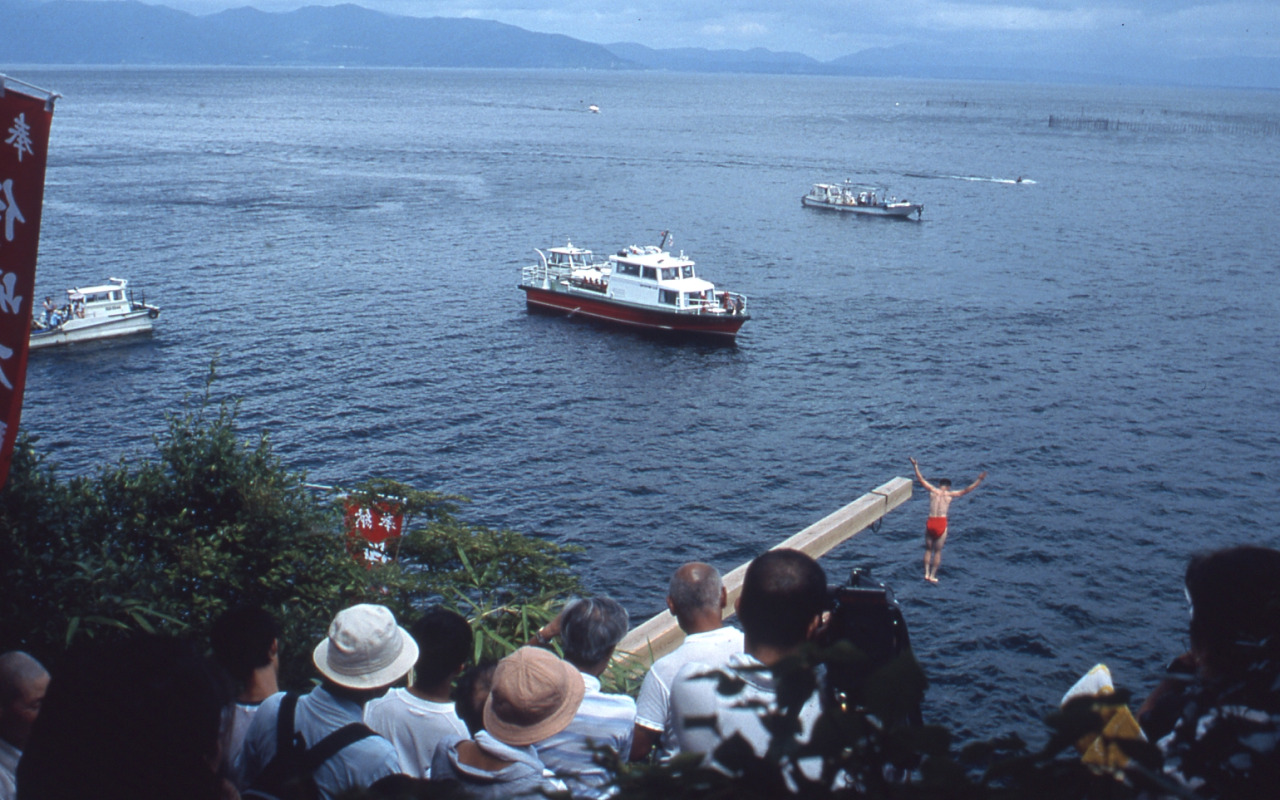 伊崎山の北側、半島部分から大きく琵琶湖に突き出た約14mの長い木の竿。その高さ約7mから海へ向かって飛び込む「伊崎の竿飛び」は毎年8月1日に行われる、1,000年以上前から続く伊崎寺(いさきじ)の伝統行事です。修行僧たちが湖へ向かって飛び込む勇壮な姿は見る人を圧倒します。もともとは修行僧が雑念を払い勇気と精神力を鍛えるために行った修行で、いまでは厄除けなど人々の願いを背負って祈願する夏の行事として受け継がれています。飛び込む人々の気迫や湖面に響く大きな水しぶきは迫力満点で、まさに”近江の奇祭”。現在は一般の方は参加することはできませんが、伊崎寺の境内にある「竿飛堂」から、あるいは毎年行われているクルーズツアーなどで船上からその大迫力の瞬間を目にすることができます。