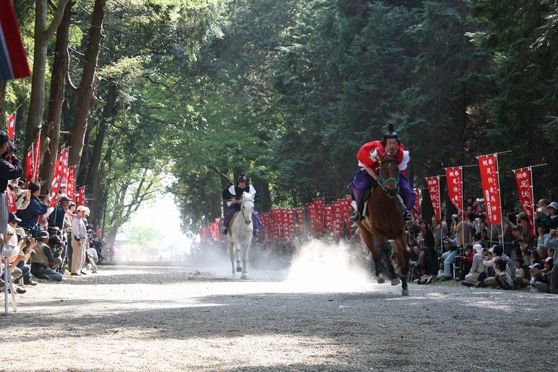 境内の木々が生い茂る中をスッと通る400mもの直線で、7頭の馬がトーナメント形式に2頭ずつ速さを競い合う姿は迫力満点。「七頭の馬、七番の神事」とも呼ばれるこの神事は、コース脇から間近に観戦することも可能です。全国でも古式競馬として見られるのは、京都府の上賀茂神社で開催される「賀茂競馬(かもくらべうま )」とこの足伏走馬だけ。馬との深い関わりと伝統を感じられるこの神事で、疾走する馬の力強さと歴史の重みを同時に味わってみませんか。