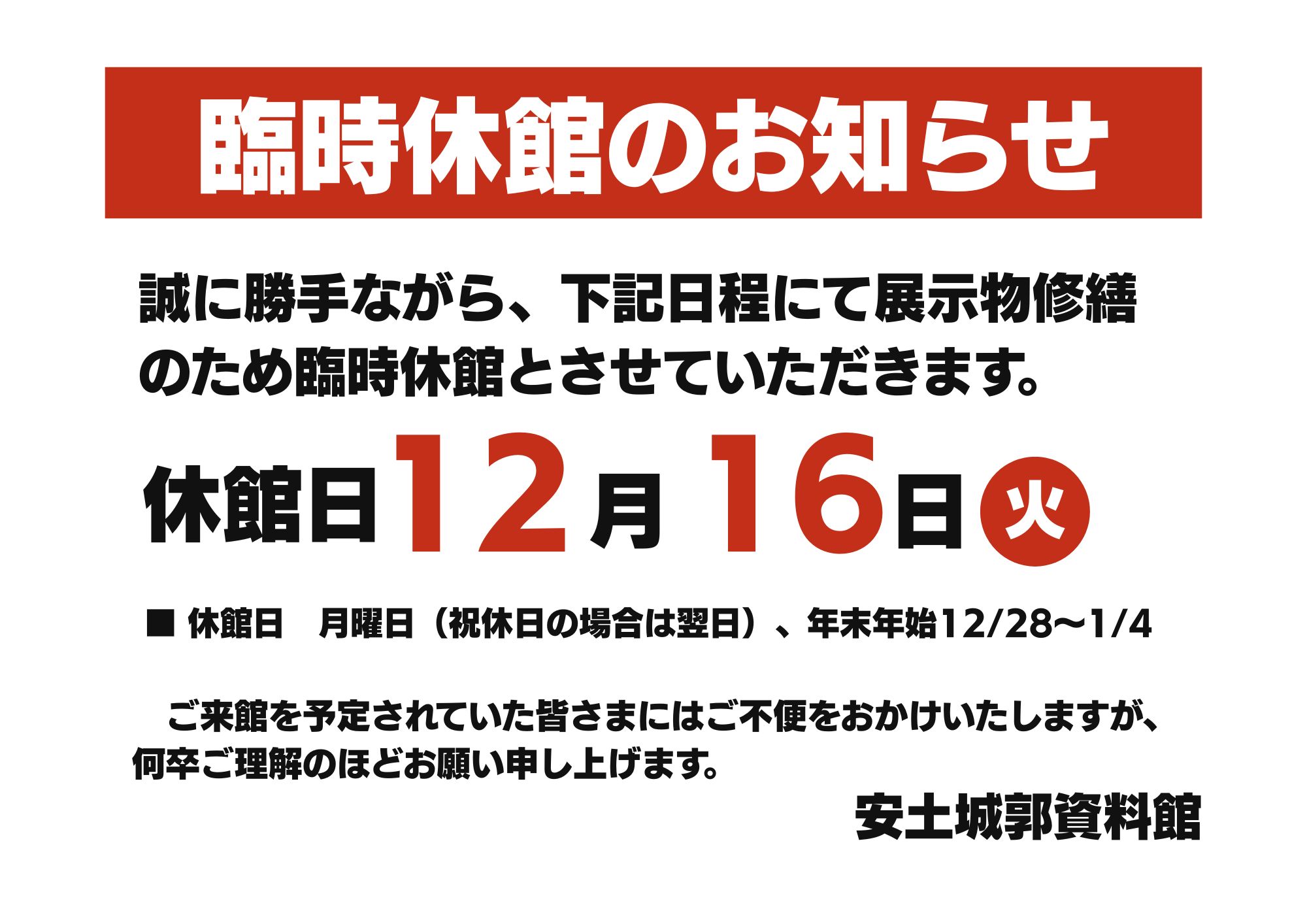 ◆安土城郭資料館より◆12/16(火)は、展示物修繕のため臨時休館です。