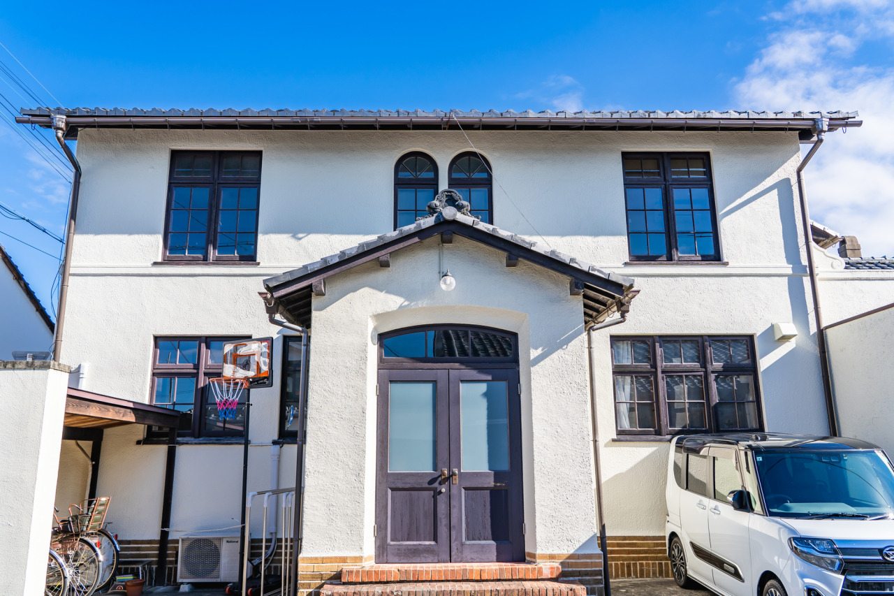 町の小道を進むと現れる白い外壁は、周囲の建物とは雰囲気が異なり目を引かれます。瓦屋根のため一見日本家屋のようにも見えますが、アーチ状の窓、あかり取り窓の格子、玄関ポーチの煉瓦の階段など、随所に西洋を感じるポイントが散りばめられています。