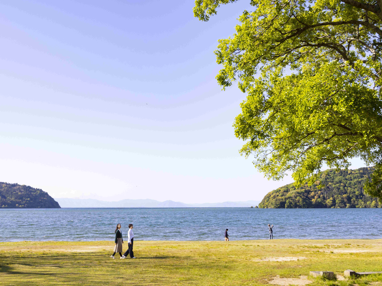 休暇村近江八幡の目の前に広がる遠浅で静かなビーチは、環境省が選定する「日本の水浴場88選」にも選ばれており、水質は最高評価「水質AA」と評価されています。水際まで芝生が広がるため、素足でも熱くならず、小さな子ども連れや家族連れでも安心して過ごせるのが魅力です。