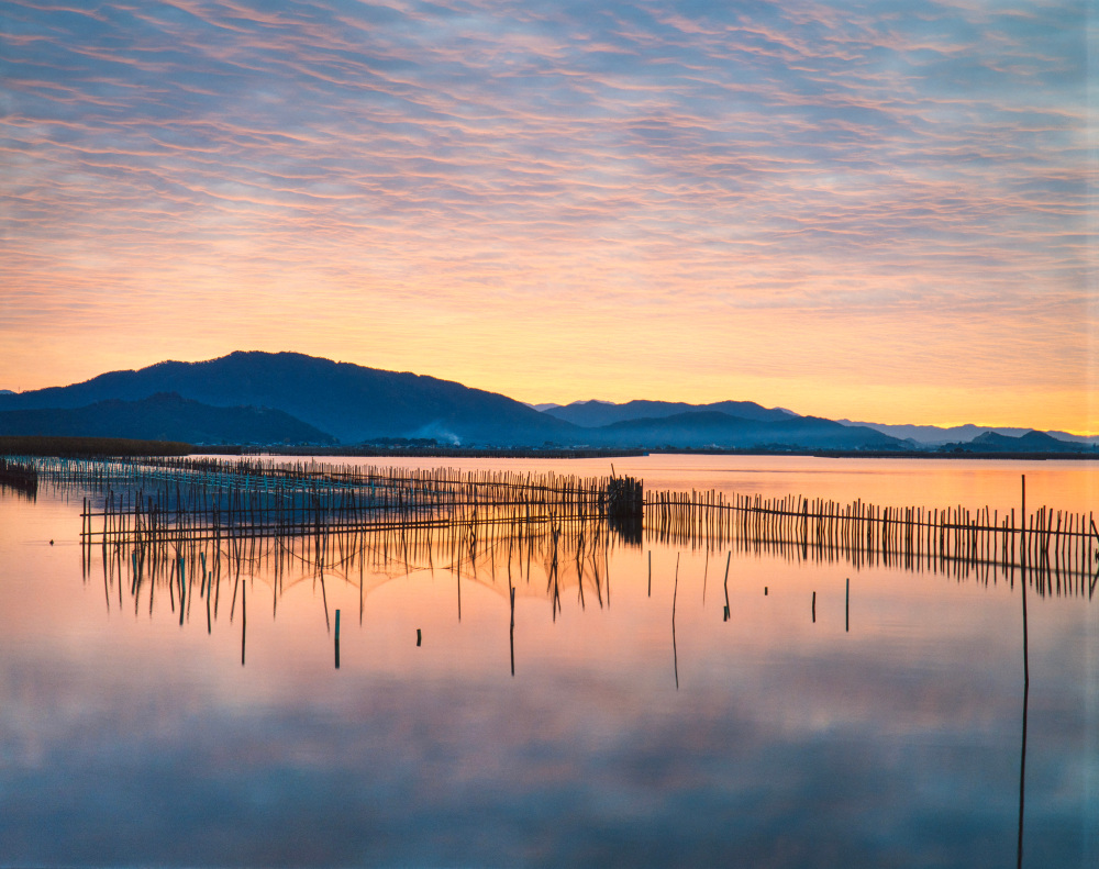 ここ近江八幡でも、冬の琵琶湖の湖面から突き出ているたくさんの棒を目にすることでしょう。これは伝統漁法「エリ漁」による仕掛けの一部です。障害物にぶつかるとそれに沿って泳ぐ魚の習性を利用したもので、千年以上前から今日まで続いています。
