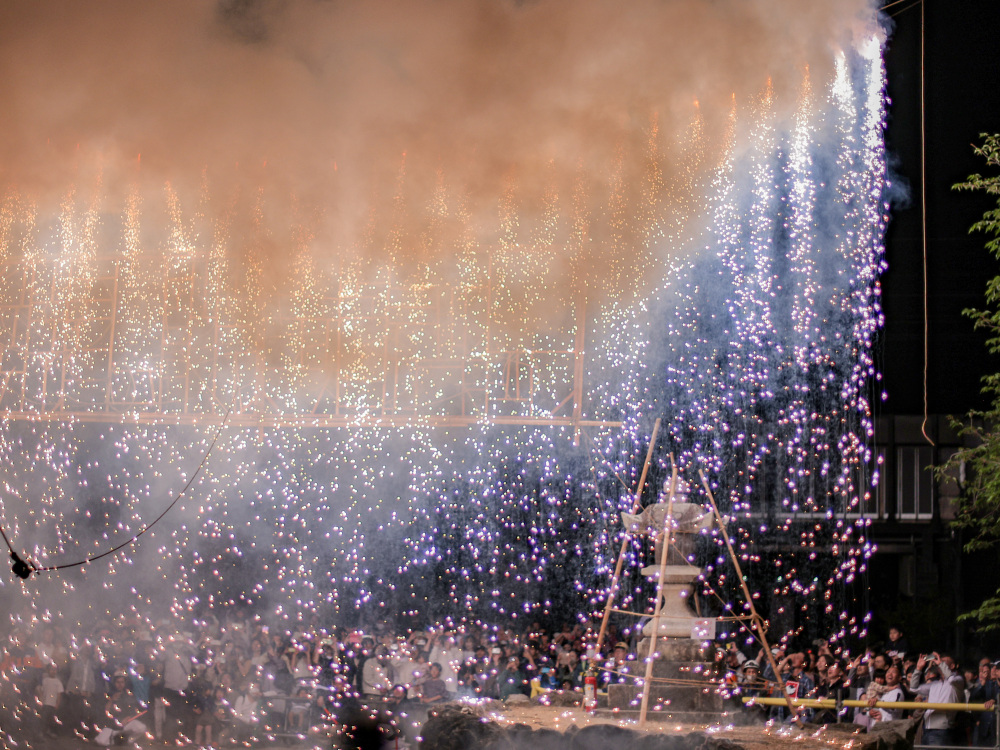 篠田の花火は毎年5月4日に篠田神社で開催されるお祭りでは、和火による壮大な仕掛け花火が奉納されます。篠田神社の境内に設置された巨大な立板に描かれた絵が、暗闇に青白い火の光として浮かび上がる様は、幻想的な趣があります。