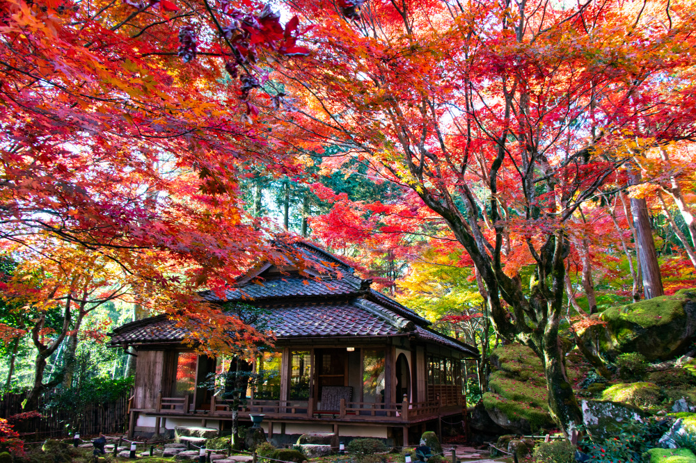 紅葉もまた近江八幡の楽しみの一つ。代表的なスポットが、白洲正子さんがその素晴らしさに感銘を受け、石の寺として紹介したことでも知られる教林坊です。期間限定の秋の公開には、紅葉を楽しむために遠方からも多くの人が訪れます。