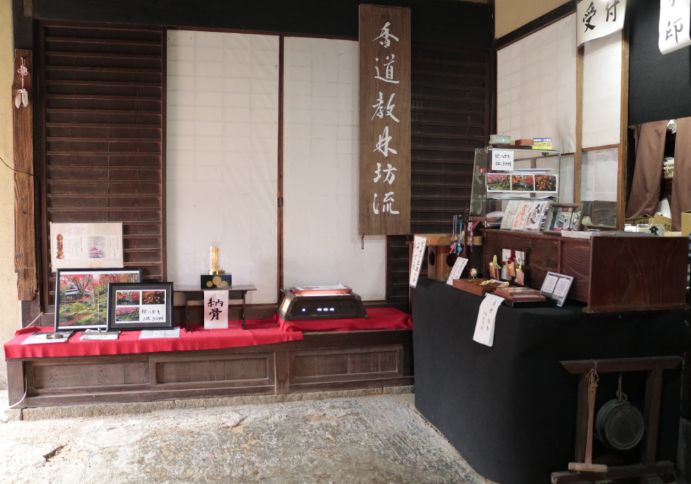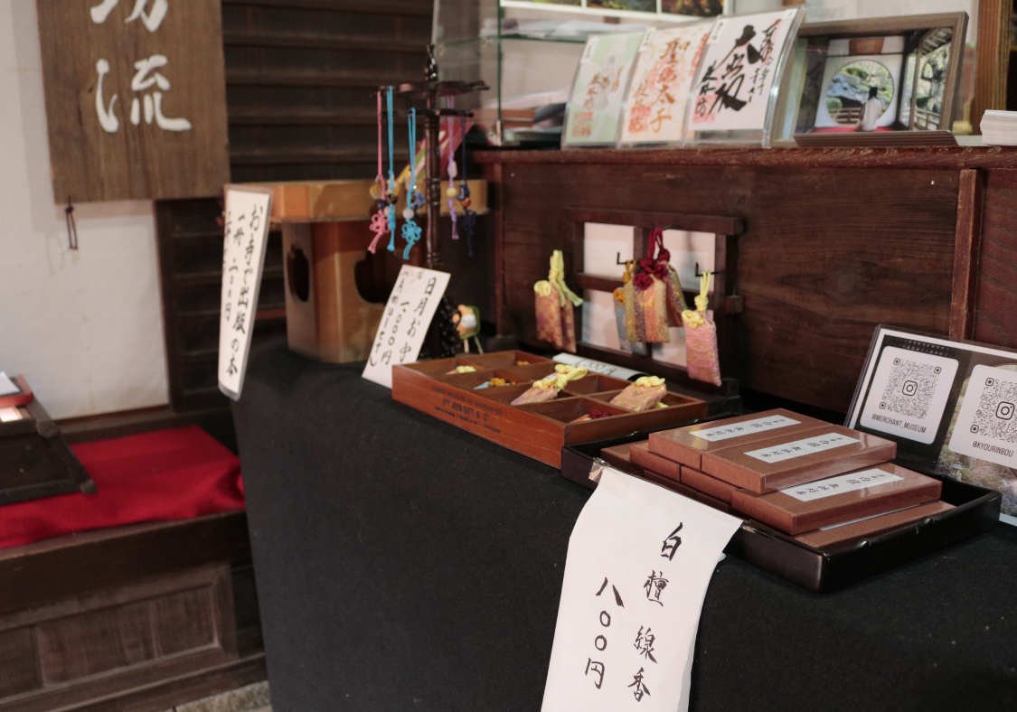 社務所の一角には、ひとつひとつ大切に並べられた御朱印やお守り、お香や小さな授与品が、静かな空間の中に整然と置かれています。