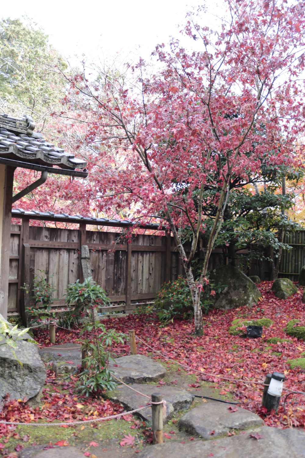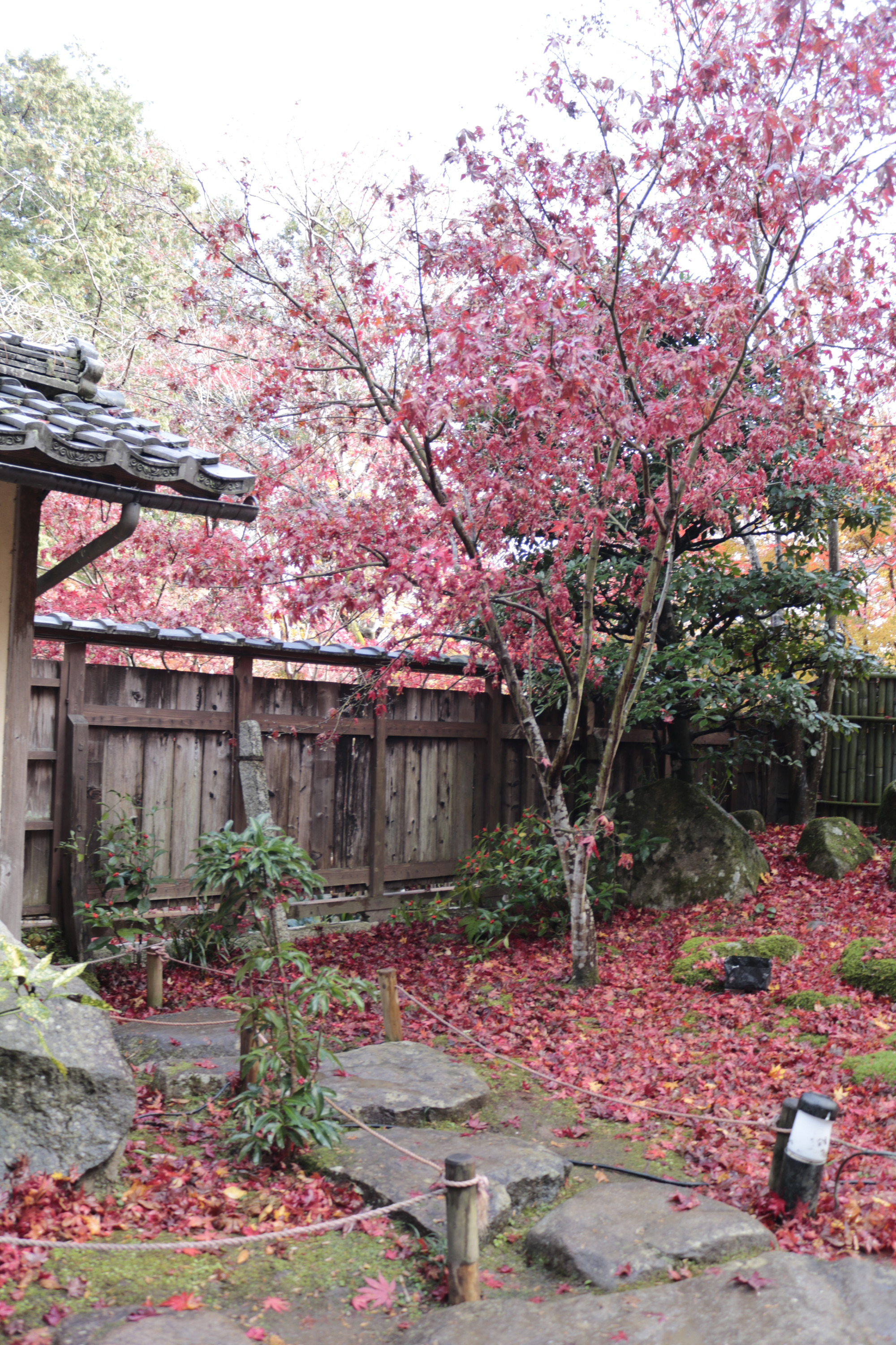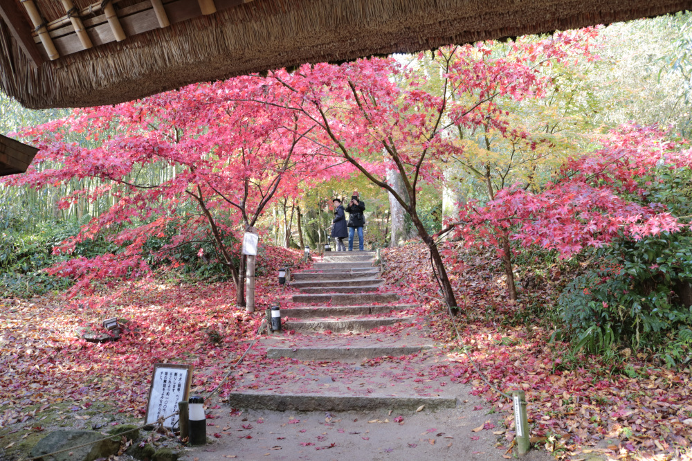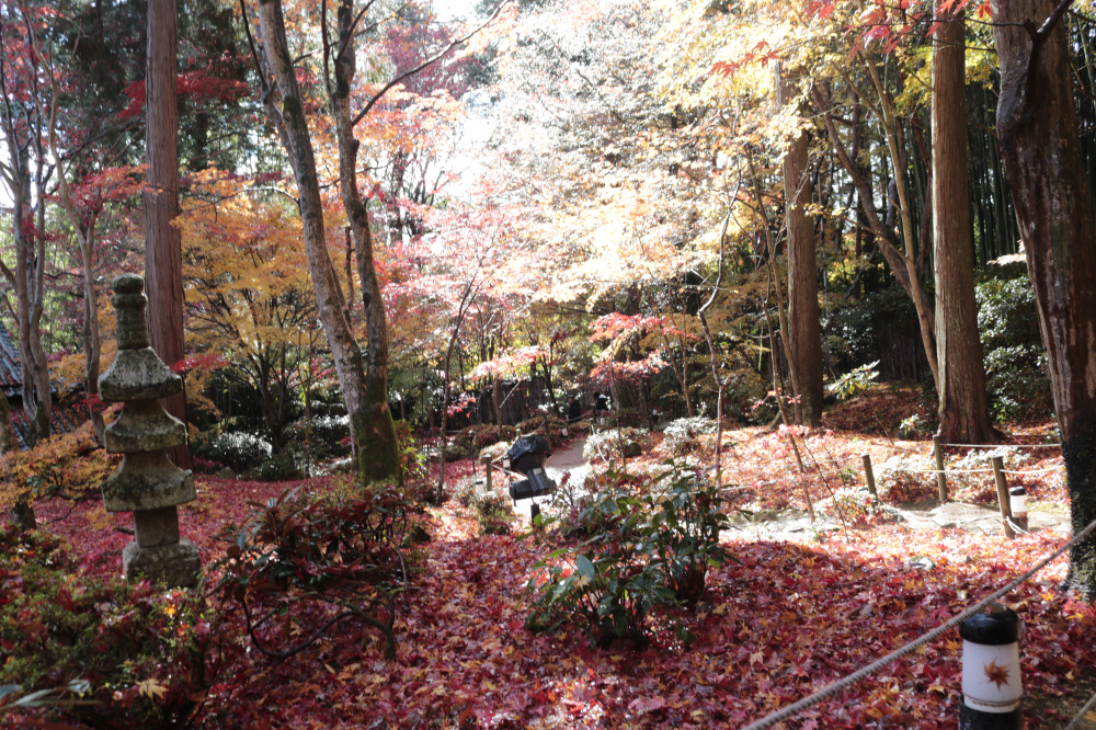 秋の教林坊は、ただ「紅葉がきれい」という言葉だけでは足りないほど、深い赤が石の参道や苔の緑と重なって、静かな中に、はっとするような鮮やかさを見せてくれます。