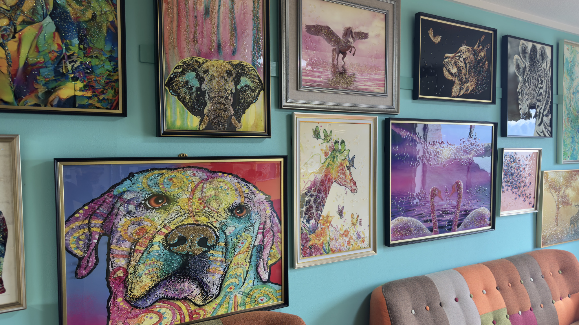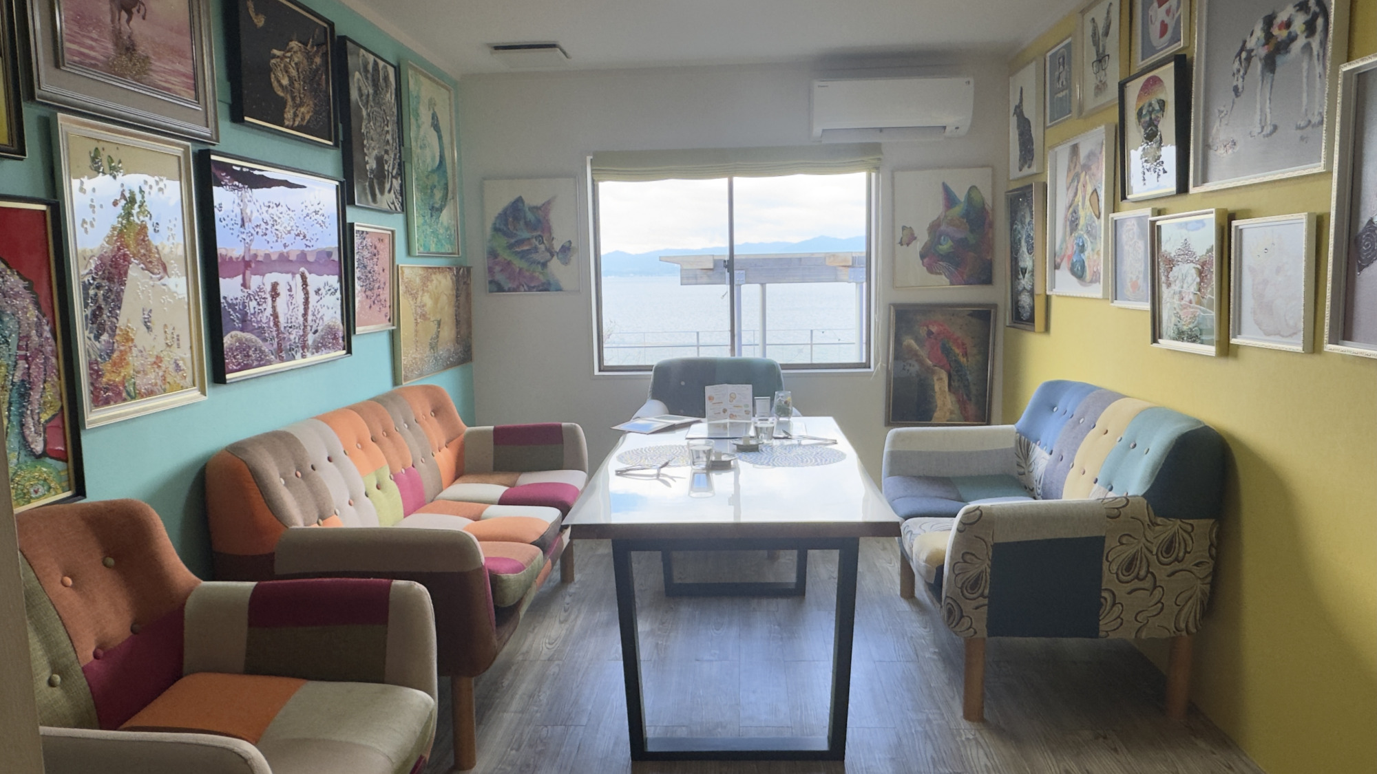 カラフルな絵画とソファが印象的で、つい写真を撮りたくなる雰囲気でした。