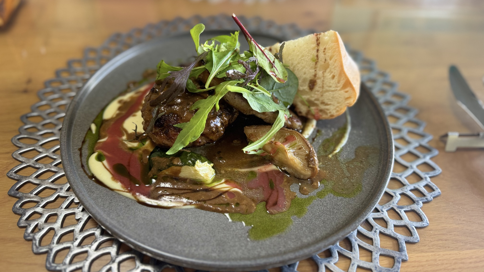 「近江牛とグラバーポークのハンバーグと自家製ベーコンのロースト」。