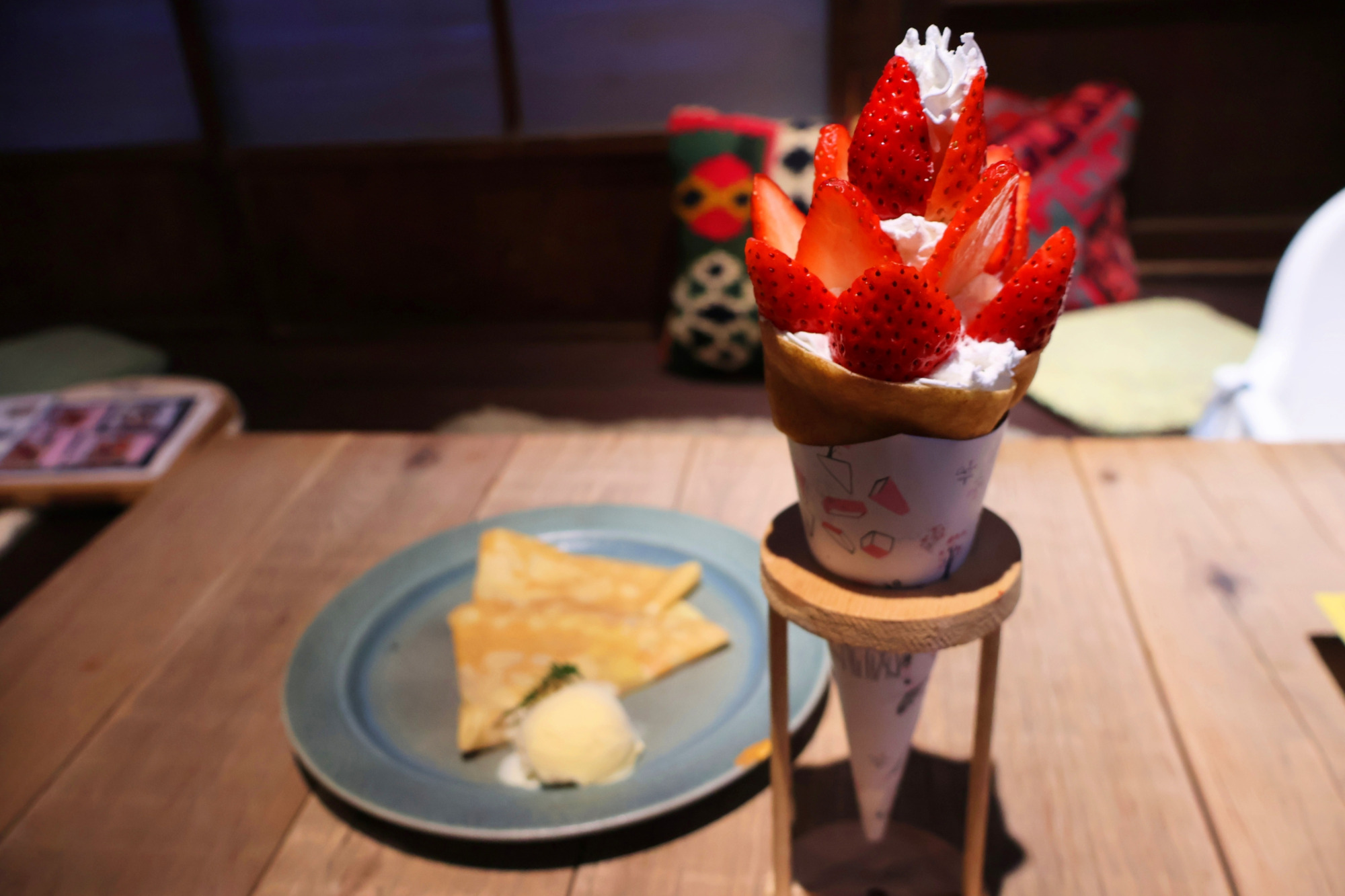 今回は期間限定のイチゴのクレープと、シンプルなバターシュガーをいただきました。