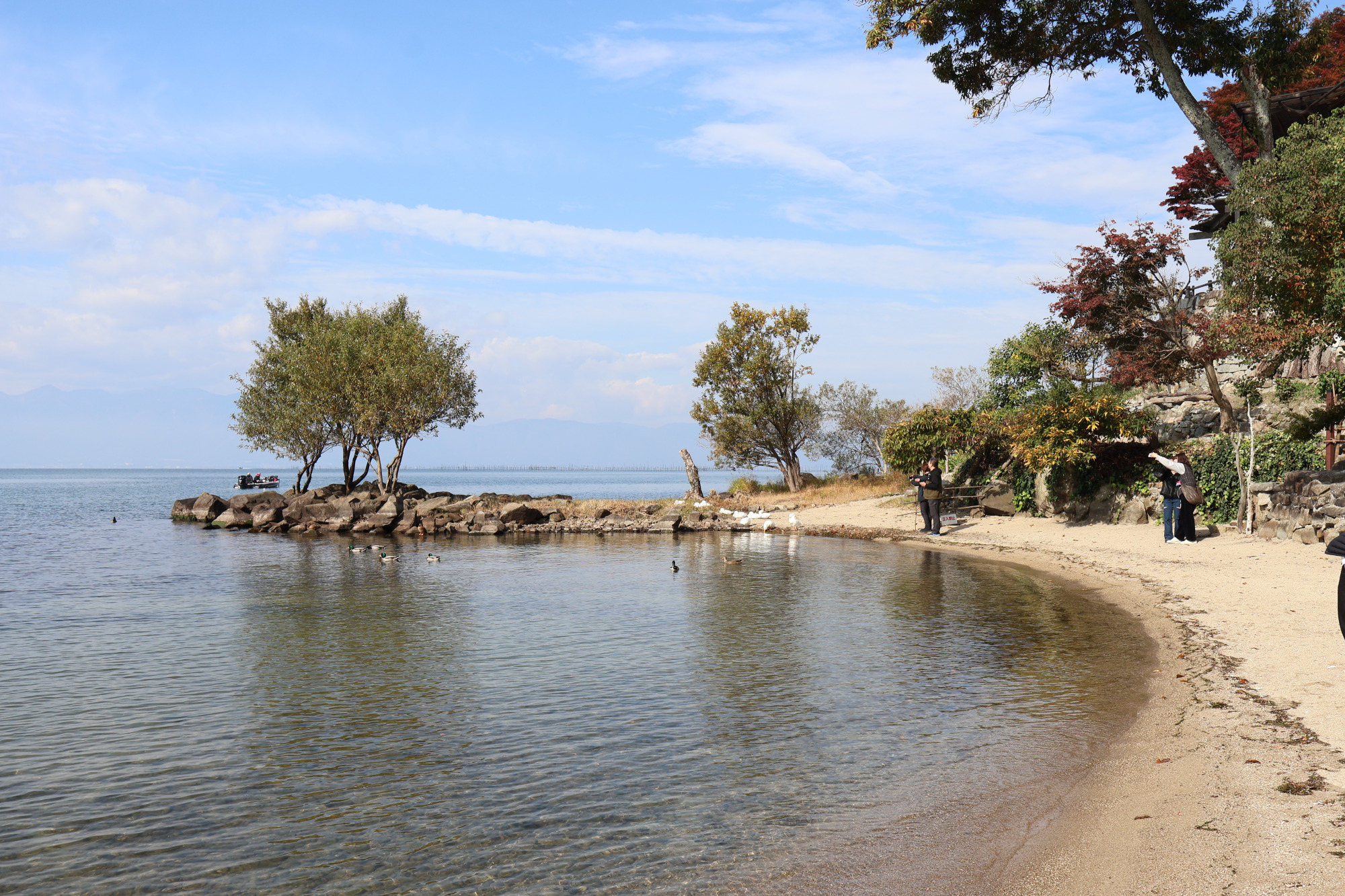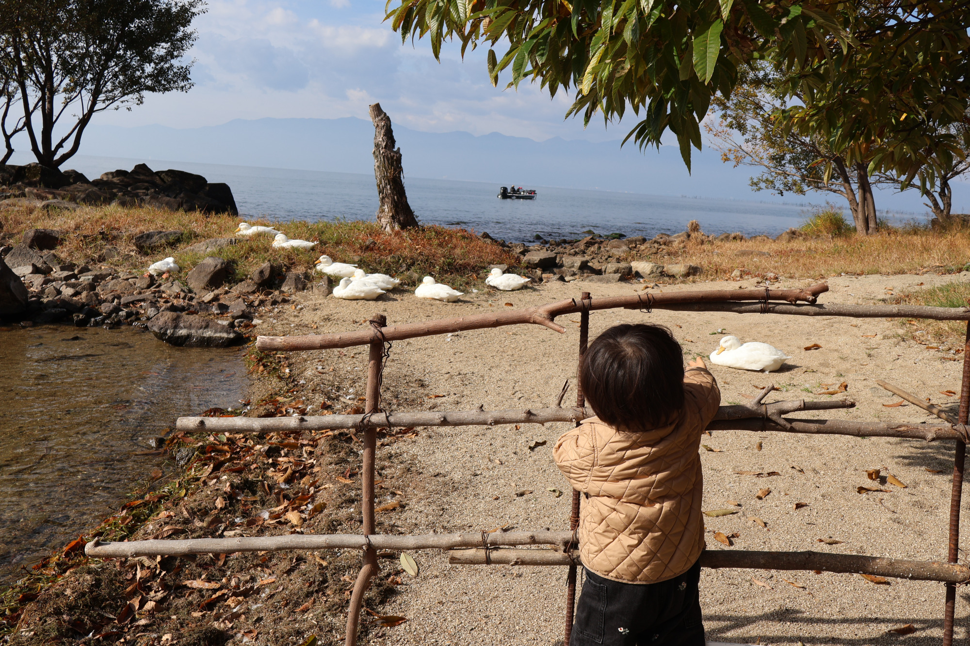 鳥のさえずりや湖を走るボートの音をBGMに、紅葉が彩る景色を眺めながら過ごす時間は格別。2歳の息子もボートに夢中でした。