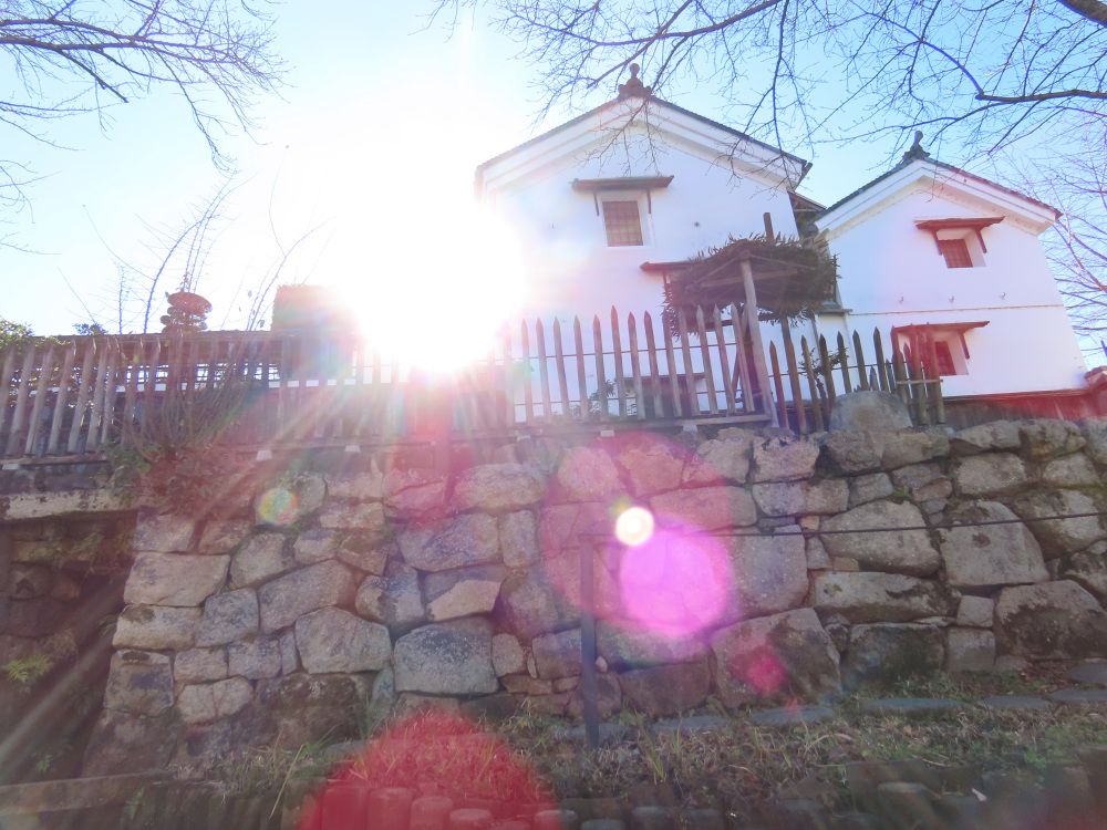 途中、見上げると、八幡山城の石垣が見えました。かつてそこには、豊臣秀次のお城がありました。